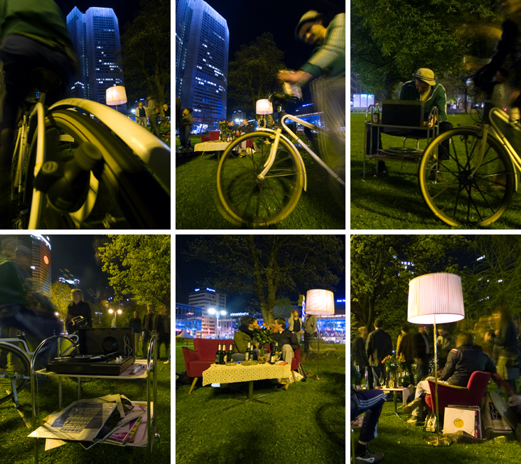 DYNAMOGLAMOUR - eine autarke Licht- & Soundinstallation zur Luminale 2006. Auf einer Rasenfläche in Frankfurts Anlagenring steht ein rotes Sofa mit einem Couchtisch davor und einer Stehlampe daneben. Aus den integrierten Lautsprechern eines Kofferplattenspielers ertönt Musik. Betrieben wird diese Wohnzimmeridylle von zwei Fahrraddynamos. Das Fahrrad ist auf einen Ständer fixiert, sodass nur das Hinterrad rotiert. Diese kleine aktive Einheit ist auf Publikumsbeteiligung ausgerichtet und angewiesen - zumindest eine Person, die in die Pedale tritt, und einen DJ. Die anderen beraten bei der Musikauswahl, tanzen oder nehmen auf dem Sofa Platz. Die Positionen können getauscht werden.