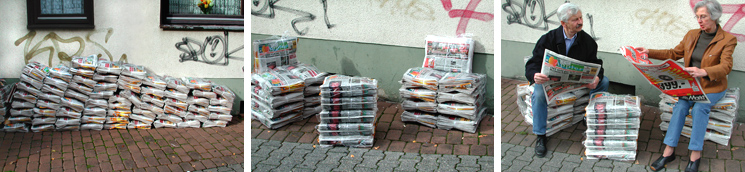 Die ZEITUNGSSESSEL sind ein Beispiel dafür, wie man sich mit wenigen Handgriffen herumliegendes Material zunutze machen kann. Eine der schnellsten Methoden zur Erstellung von Straßenmobiliar.